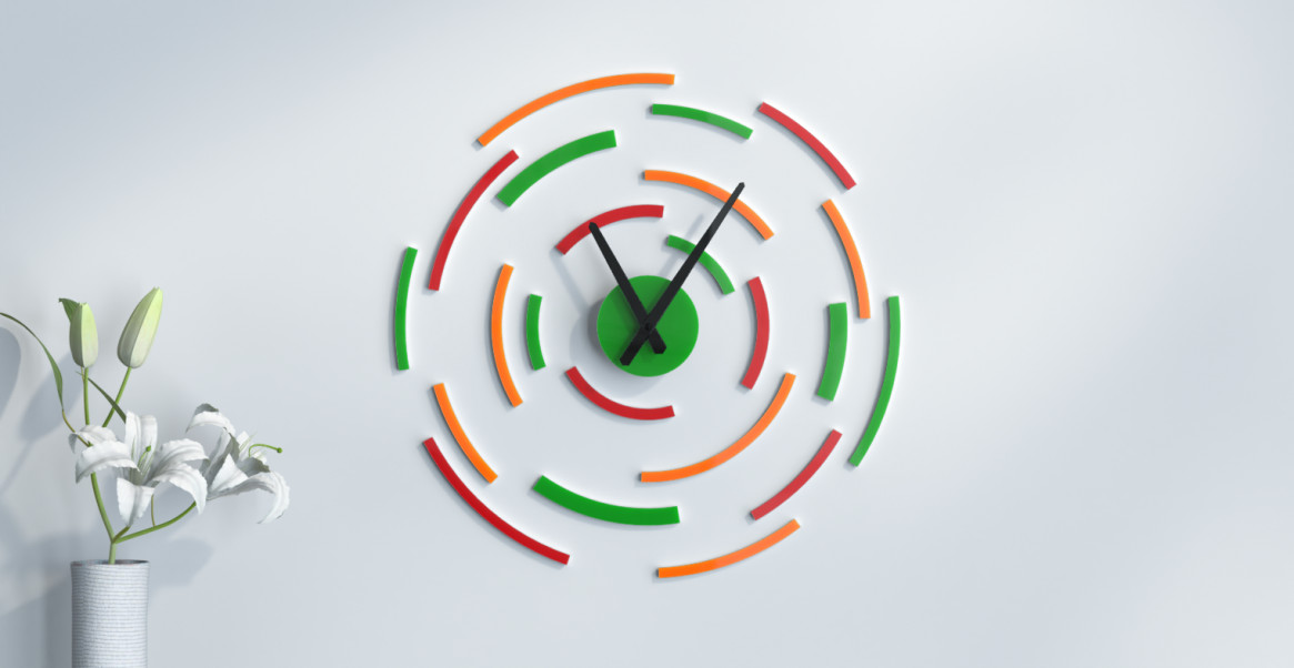 Grande horloge murale design sans cadre fabriquée en France - modèle rond de 50 cm, de couleur vert, orange et rouge. Grâce à ce configurateur vous pouvez personnaliser votre grande horloge murale design sans cadre fabriquée en France.