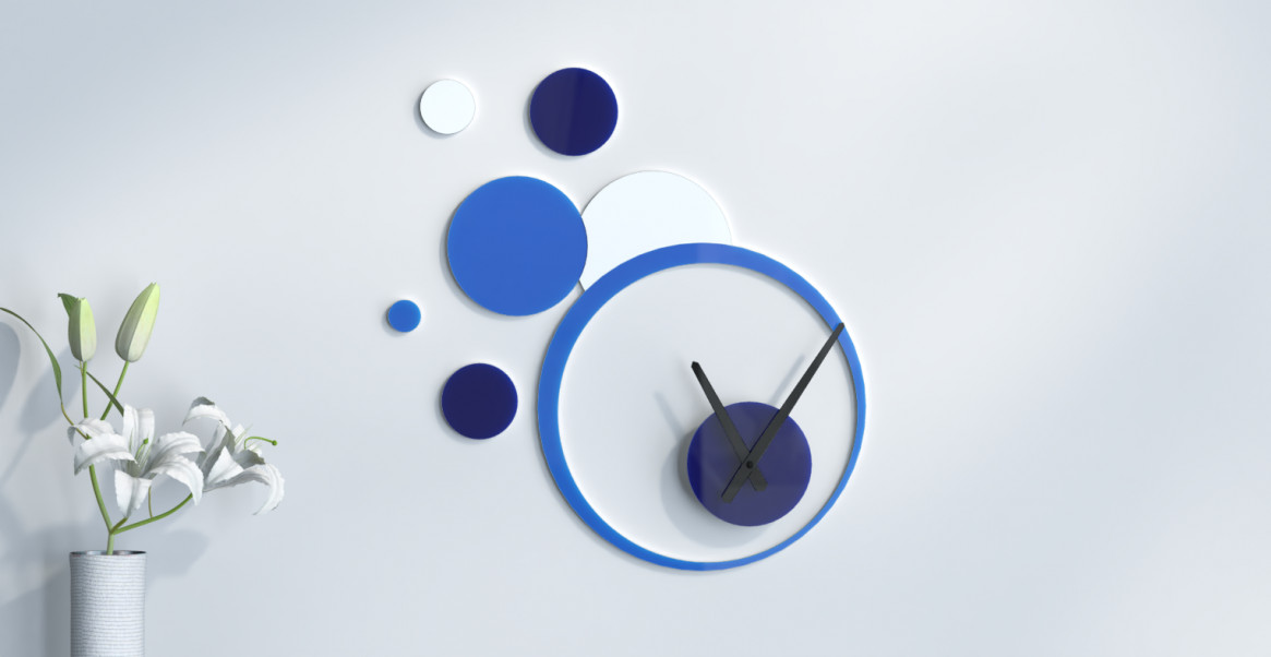 Jolie et grande horloge murale design sans cadre fabriquée en France - modèle ronde 50 cm, de couleur bleu ciel, bleu marine et blanc. Grâce à ce configurateur vous pouvez personnaliser votre jolie et grande horloge murale design sans cadre fabriquée en France.
