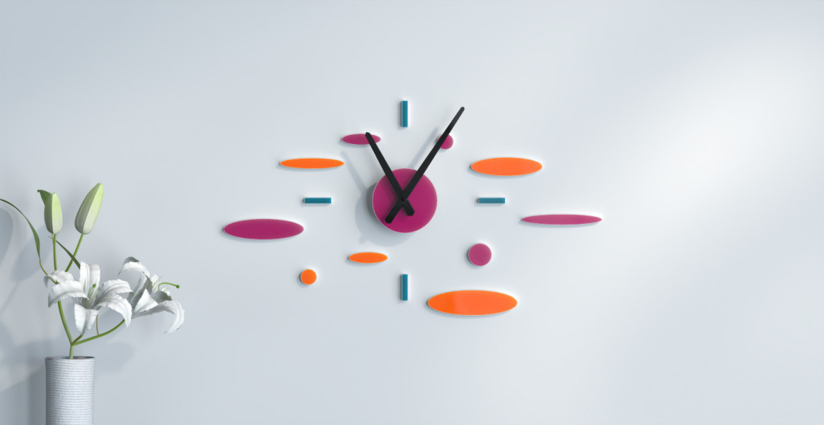 Pendule murale grande et moderne en plexiglass fabriquée en France - modèle Planeta de 60 cm, de couleur rose, orange et bleu canard. Grâce à ce configurateur vous pouvez personnaliser votre pendule murale grande et moderne en plexiglass fabriquée en France.
